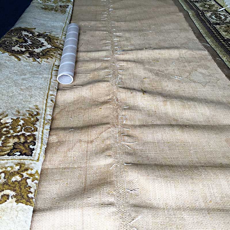このタイプの機械織り絨毯は修理可能なので 手織り絨毯と同じ様に経糸を入れなおしてつないでいきます |